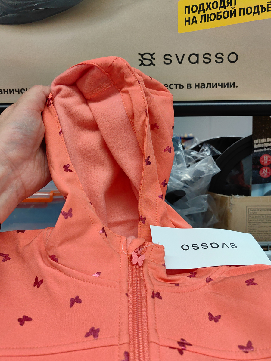 В магазин Чижик прибыли новинки, актуальные для осени, комфортные для дома, не без пользы. Что привезли? Яркие, не промокают, потому что сверху слой из мягкого и одновременно плотного софтшелл. Не дадут осеннему дождю и прохладе пробраться под курточку. Яркие, детские, розово-морковная для девочки, для мальчиков свои курточки, обязательно покажу. Развернула, внутри курточки флис, не рыхлый, тепленький. Это капюшон. Без утяжек, по сути, и не нужны, так как модель такая, что шея прикрыта. Не слетит с головы во время ветра и дождя. К бегунку молнии прикреплена фигурка бабочки, край молнии прикрыт, не будет царапать кожу. Покажу курточку целиком, с двумя карманами, оба на молнии. Не приталена. Принт - крошечные бабочки, такие же, как на бегунке. Ростовка максимальная 140, для девочек ростом от 98 см. Для мальчиков серо-голубые ветровки, пятнистые. Окантовка яркая, салатовая. Отличается от той, что на этикетке. Впервые за два года обзоров так, что этикетка и расцветка вещи отличаются