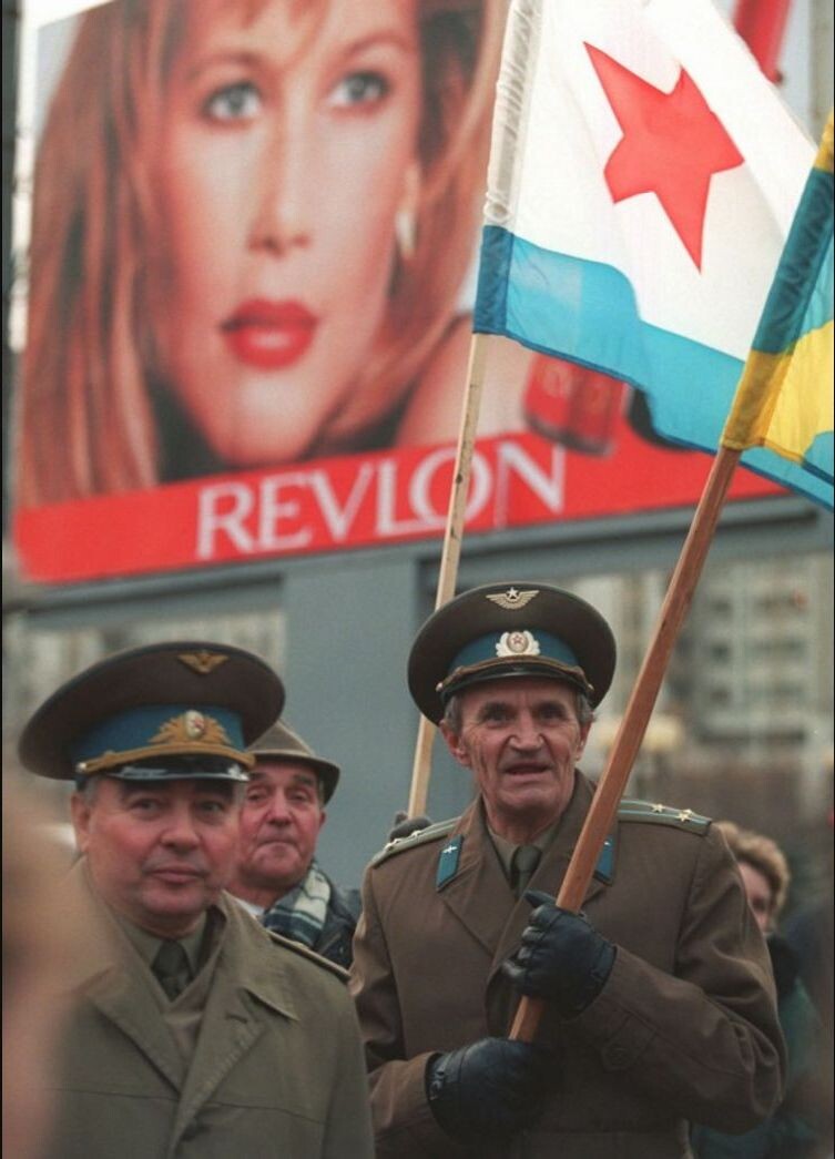 Вот тоже весьма примечательный кадр из 1991 года. Рынок успешно формируется и для продвижения каких-то товаров можно использовать лицо, ещё вчера бывшее лицом огромной страны.