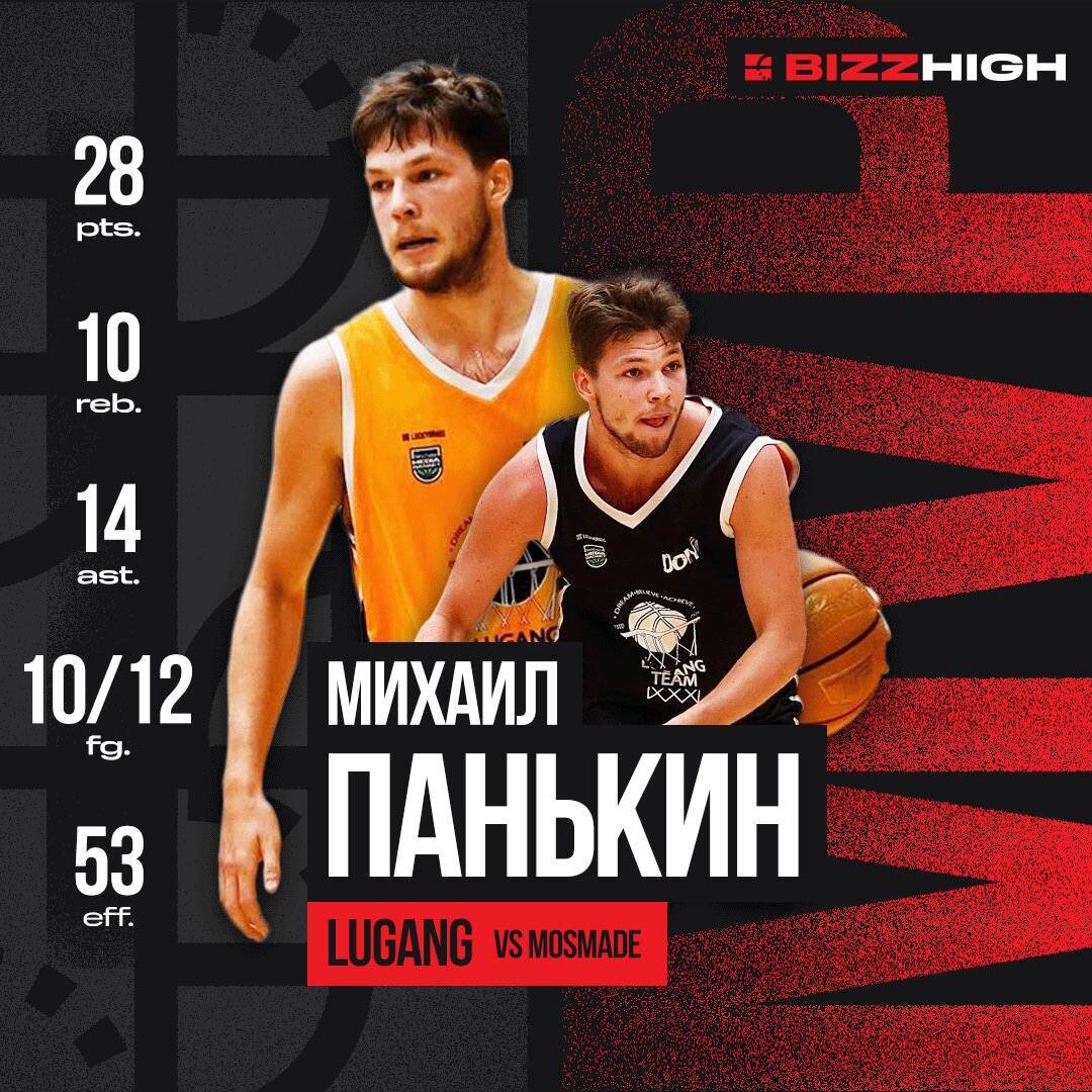 MVP ABL Bizz Панькин Михаил (LUGANG) vs Mosmade 107:75 28 очков, 10 подборов, 14 передач, 10/12 с игры , 53 эффективность В финальном туре регулярного чемпионата ABL Bizz High встретились две сильнейшие команды корпоративной лиги: LUGANG и Mosmade. LUGANG шли без поражений, но учитывая заявку на игру у Mosmade на первый взгляд появились шансы нанести первое поражение, но не тут то было. LUGANG на эту игру довезли Захара и Панькина и этого было достаточно, пока Захар был первой опции в нападении и забивал всё подряд, Панькин делал буквально всё, Михаил раздавал передачи, подбирал на своём и чужом щите и в конце концов забивал броски на космическим проценте - 10/12 с игры. По итогу встречи, Михаил собрал трипл-дабл на безумной эффективности - 53, а сами LUGANG пробили первую сотку, не оставив и шанса Mosmade. 1️⃣@ABL Moscow