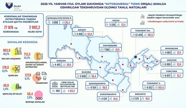 В период с января по июль 2025 года предпроверочным анализом были выявлены недочёты в отчётности 77 976 хозяйствующих субъектов. Ими был представлены перерасчёты в сторону увеличения налогов, на общую сумму 2,1 триллиона сумов.