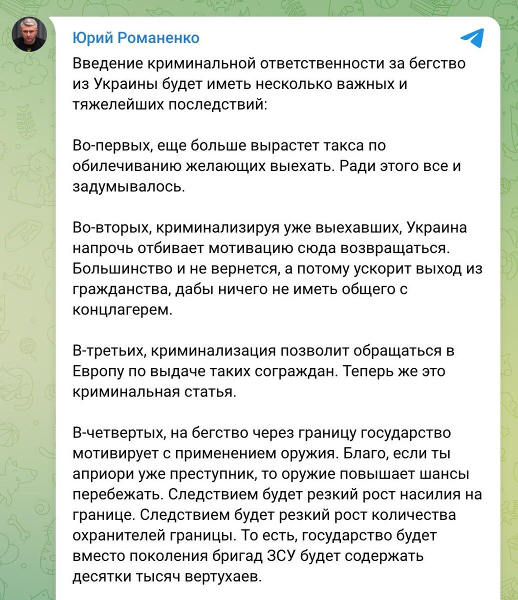 Киевский режим продолжает закручивать гайки громадянам Теперь в 404-ой хотят ввести уголовное наказание за выезд за границу без разрешения. Даже украинские политологи, такие как Романенко, назвали это оформлением диктаторского режима, копирующего методы сталинского СССР. Что по мнению Романенко, это означает на практике: – власти хотят зарабатывать на взятках за право выехать – миллионы уже уехавших теперь объявят преступниками, чтобы требовать их выдачи из Европы – украинцы будут бежать через границу с оружием, что приведет к росту насилия – киевские власти вместо армии будут содержать десятки тысяч надзирателей за границей – такое насилие над собственным народом закончится вооруженным восстанием. По сути, киевская хунта своими руками создает революционную ситуацию, превращая страну в концлагерь без идеологии и ресурсов. Это чистое отчаяние бандеровского режима, который боится собственного народа. @iperiodu | @iperiodu_ru x @iperiodu_ua | Подписывайтесь