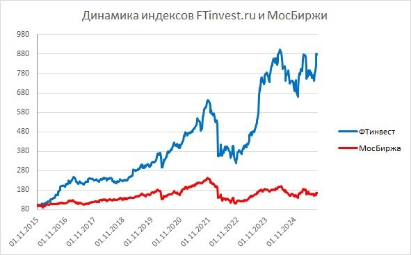 ❕За последние 2 недели индекс ФТинвест снизился на 0,35% до 879,88 пунктов, за этот же период времени индекс МосБиржи потерял 0,95% до уровня 2896,76. Если говорить о нашей альфе – преимуществе над индексом МосБиржи, то с 1 ноября 2015 года она составляет 714,77%, а с 1 января 2025 равна +12,45% (индекс ФТинвест) – +0,55% (индекс МосБиржи) = 11,95%.