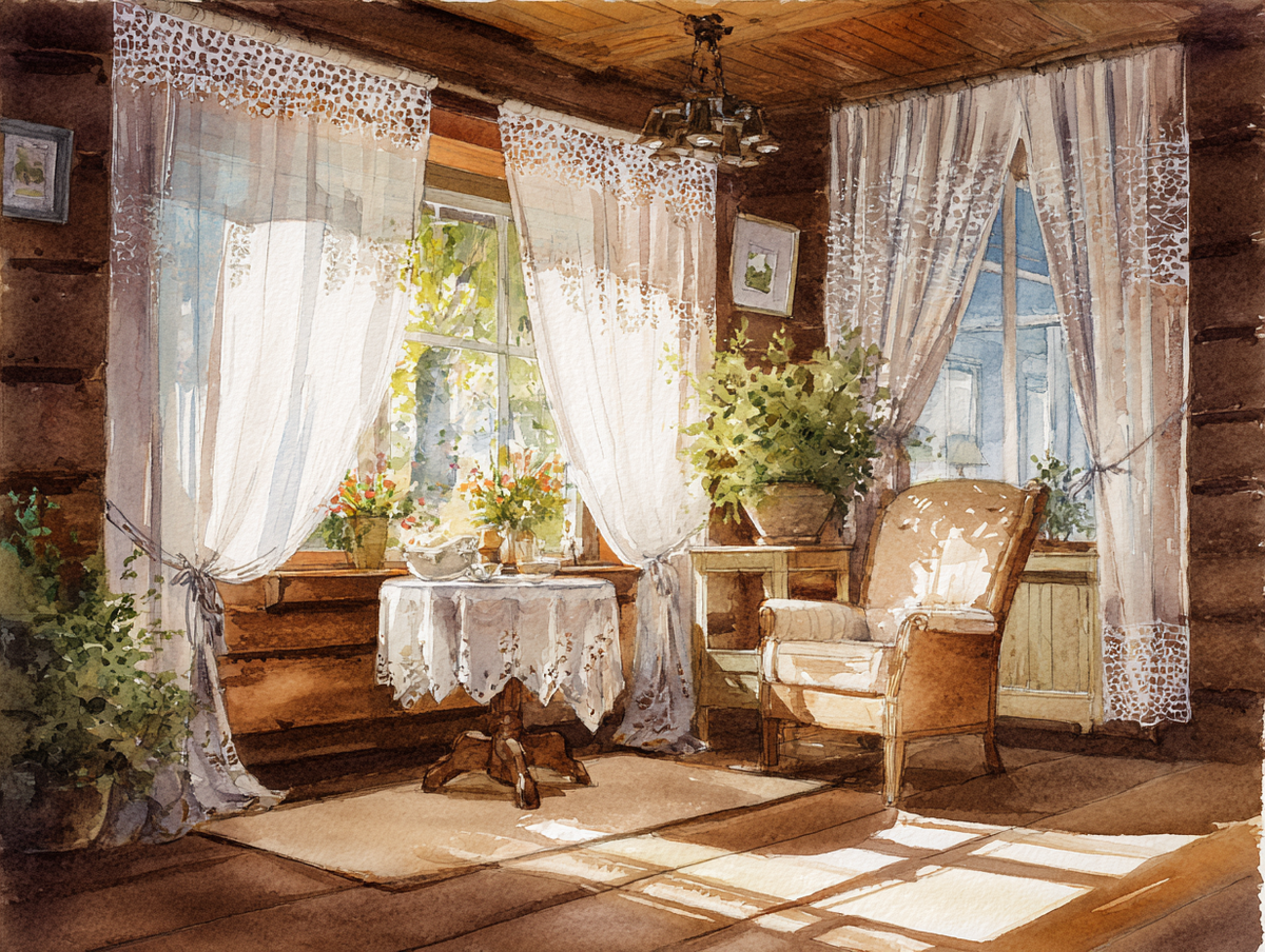 Есть дачи с новыми кухнями, красивыми плитками и душевыми кабинами. А есть далеко не новые, но туда всегда возвращаешься с ощущением, что домой. Деревянные стены потемнели от времени, половицы скрипят в знакомых местах, в воздухе пахнет деревом, сухими травами и солнечной пылью. Всё на своих местах — как будто только вас и ждали. Шторка в цветочек, подоконник, рядом с которым так удобно сидеть с книжкой, стакан с ложками у плиты и старое кресло, в которое так приятно провалиться после жары. Это статья-ностальгия, статья-впечатление. Прочитать и прочувствовать настроение. Много красивых фото для вашего вдохновения: некоторые - акварель, некоторые - фото. Скрипучие половицы Стоит сделать шаг — и дом отзывается. Одним звуком — в прихожей, другим — в спальне. Словно старые друзья подают голос: «Ты вернулся». В городе скрип пола только раздражает, а здесь — успокаивает. Особенно ночью: когда весь дом спит, и слышно только, как кто-то осторожно прошёл на кухню за водой. Запах деревянн