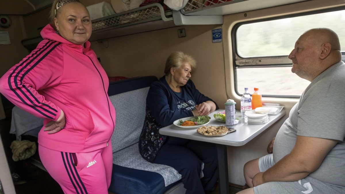 И тут Нина просто застыла в изумлении. За столиком, образованным из её бывшей нижней полки, сидели Тамара Петровна и крупный мужчина средних лет, а рядом стояла женщина в ярко-розовом спортивном костюме. Всё пространство стола было заставлено их едой.
