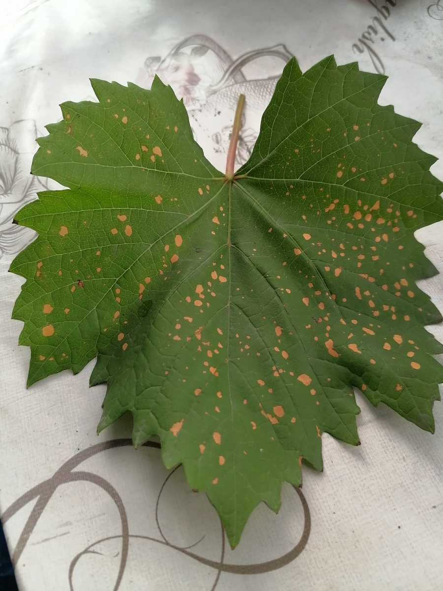 Всем мира и добра! Продолжаю. Вопрос Здравствуйте, что это может быть? Обрабатывал содой и фосфорнокалийными Это может быть химический ожог листовой пластины от проведенной обработки. За эту версию говорит капельное расположение ожогов. Именно так выглядят капли на листе при опрыскивании без прилипателя. Вопрос Здравствуйте, подскажите, что с лозой. На отдельных лозах лист сохнет, затем соцветия засохли и лоза голая стоит. Спасибо. Здесь на фото можно при внимательном рассмотрении увидеть сразу два заболевания. Первое - это милдью/ложная мучнистая роса. Скорее всего её проявления видны на листьях (красные овалы). Но есть ещё вероятно и грибок фомопсиса/черной пятнистости на лозе. Черные пикниды даже имеют небольшое превышение над лозой, которое при этом ракурсе видно (красные кружочки). Обратите внимание на желтый эллипс, где видна только одна пикнида. Это свидетельствует о том, что черные точки не особенность лозы, как, например на Августине, а именно поражение грибком. Цветение