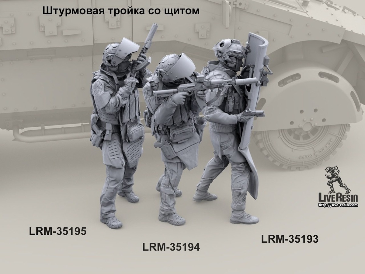 Live Resin из Москвы выпустила на 3D-принтере фигуры штурмовой тройки ФСБ со щитом для модели "Фалькатуса" в масштабе 1/35 от Arma-Models.