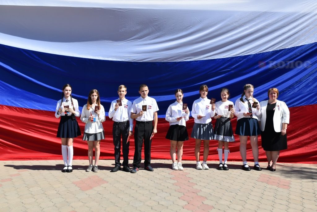 22 августа в Песчанокопском состоялась патриотическая акция в честь Дня Государственного флага Российской Федерации. Перед районным дворцом культуры «Юбилейный» завернули огромный триколор. Почетную вахту у главного символа страны несли юнармейцы и представители Движения Первых. Активисты патриот объединений вручили присутствующим ленточки с триколором. А ведущие мероприятия рассказали о значении каждого из трех цветов российского флага. В рамках мероприятия заместитель главы администрации Песчанокопского района по социальным вопросам Нина Придворова вручила главный первый документ каждого гражданина России — паспорт — ребятам из СОШ №1 и СОШ №2, достигнувшим 14-летнего возраста и отличившимся в общественной и социально-значимой деятельности. Обращаясь к школьникам, Нина Владимировна пожелала ребятам успехов в учебе, во всех начинаниях и обязательно стать достойными гражданами страны, оставаться верными своей малой родине и Отечеству. В честь праздника коллектив РДК «Юбилейный» подгото