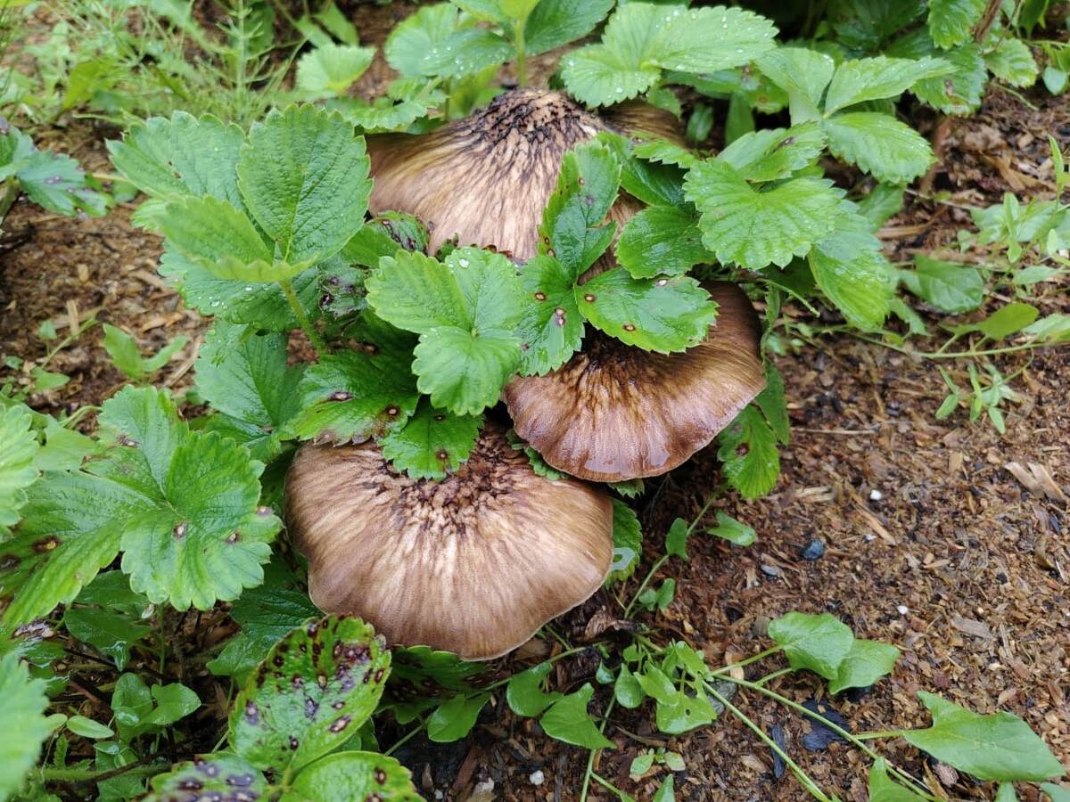 Конец августа. Стоит дождливая погода. Плодоношение грибов. Колли́бия широкопластинчатая, среди кустиков земляники ремонтантной. 23 августа 2025 А это массовое плодоношение Строфарии: На одной территории со Строфарией начинает плодоносить Гриб-зо́нтик пёстрый (лат. Macrolepiota procera). Вопросы и ответы. Плодородие почвы, что это такое? (продолжение 1). "Еда для грибов приехала" (цитата). Хроника дня, 26 мая 2025 Появились первые грибы в саду, весна 2025.
