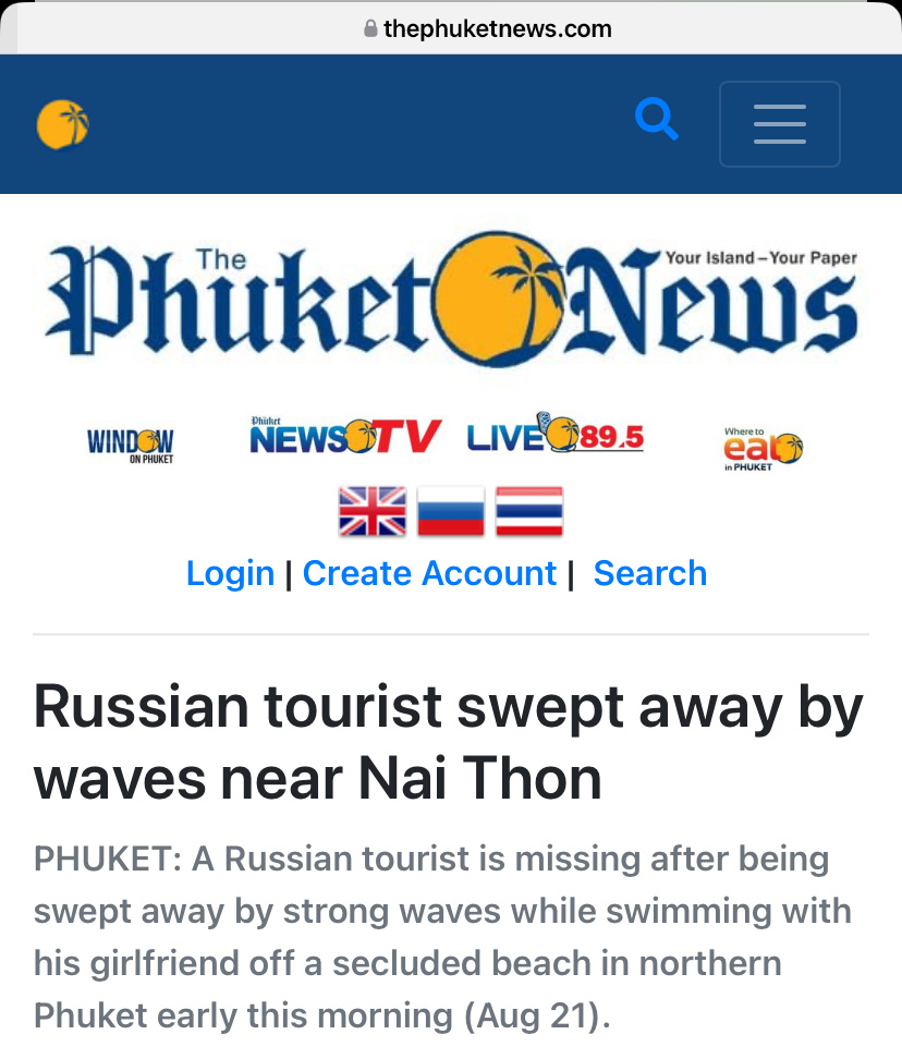 Да, это лето жестокое. Это уже не первый россиянин. И снова на опасном острове. Подробности. Привет, с Вами Елена. Люблю давно и очень. Пхукет одно из самых интересных тайских местечек, хотя Хуахин мне понравился даже больше. Здесь есть всё: классные пляжи, все очень разные, на любой карман и вкус, не грязное море, неторопливая вечерняя жизнь и улыбающиеся тайцы, здесь их переизбыток и, поверьте, они более искренние, чем на материке. На днях тайское издание The Phuket News опубликовало страшную историю. О том, как погиб российский турист. Август, да и все летние месяцы, это несезон на Пхукете. Всегда высокие волны и отбойное течение! Которое даже местных, которые выросли здесь и плавают, как боги, затягивает в пучину океана. Местные люди, зная это, не купаются на волнах. Пляж Nai Thon Beach (Найтхон бич) находится на северо-западе острова, трагедия произошла здесь. Между Найтхоном и Банана Бич. Молодые люди, мужчина был с 24-летней девушкой, ночью решили искупаться. Он утонул, и теч
