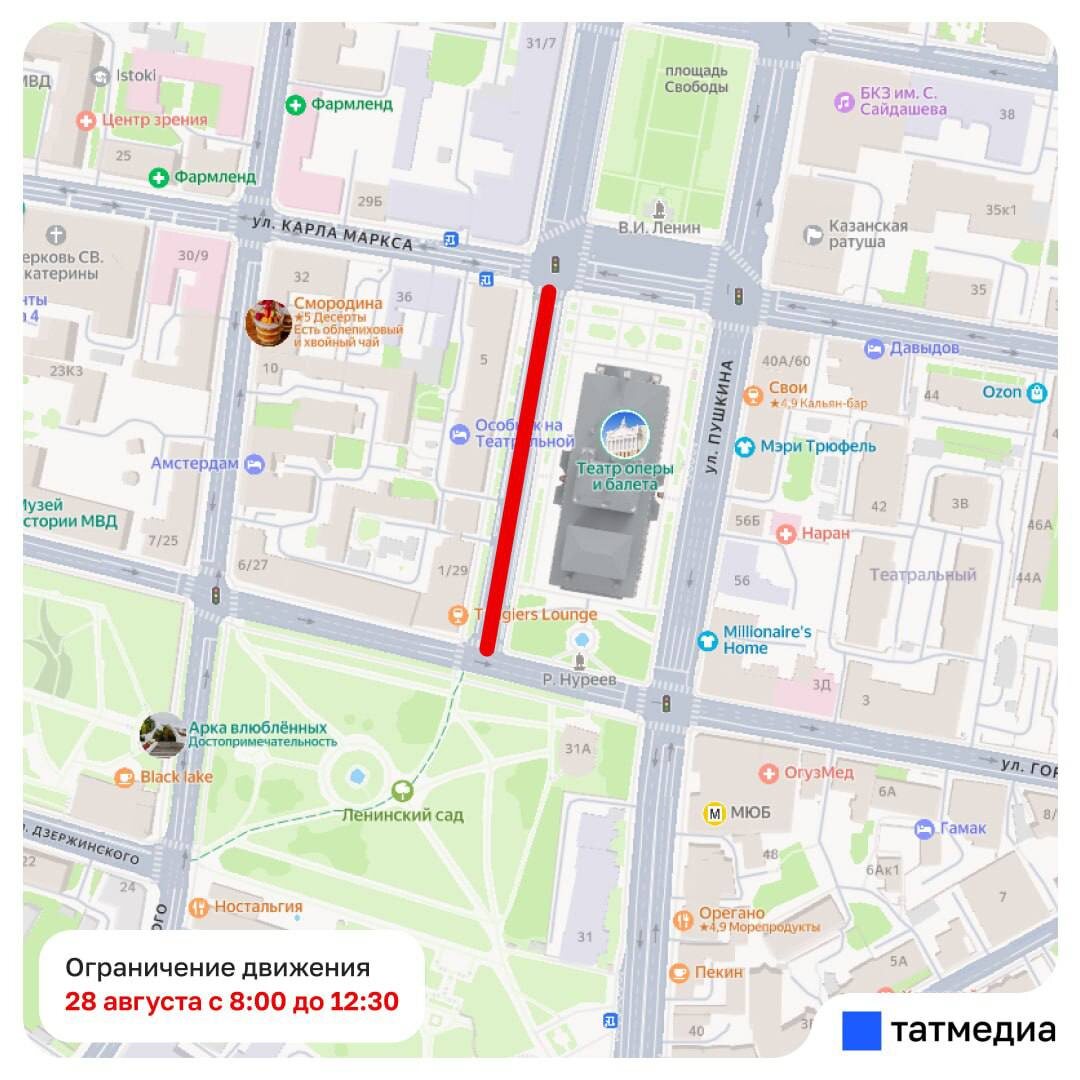 В ответ на пост ❌🚗В Казани частично ограничат движение по улице Театральной Причина – проведение национального собрания «Милләт Җыены». Ограничения будут действовать 28 августа с 8:00 до 12:30 на участке от улицы Карла Маркса до улицы Дзержинского. @tatmediaofficial | Все каналы Татмедиа