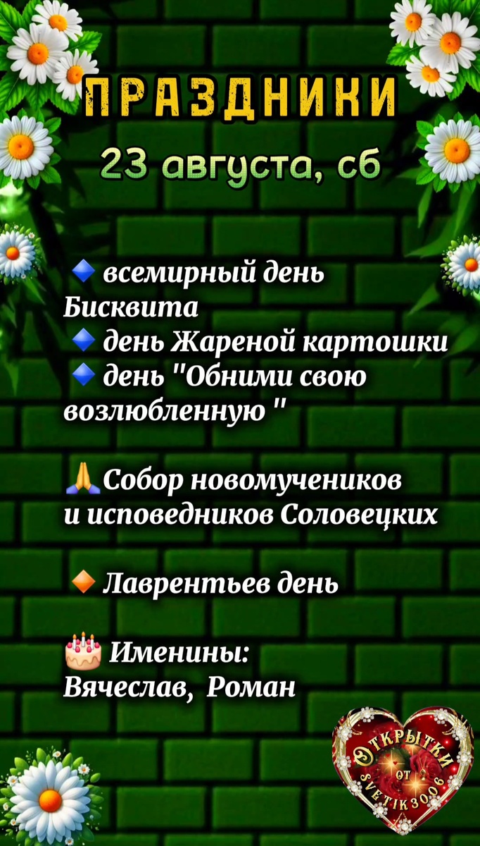 🔸️Лаврентьев день. В полдень 23 августа жители деревни шли к реке или озеру, чтобы посмотреть на воду. Если вода была спокойной, значит осень будет теплой, а весна — мягкой. Если на воде были волны, значит осень будет ненастной, а зима морозной. А еще в Лаврентьев день собирали росу и умывали ей лицо. Считалось, что в праздник она может продлить молодость и сохранить красоту. А вот ходить босиком по росе в праздник запрещалось — можно заболеть.