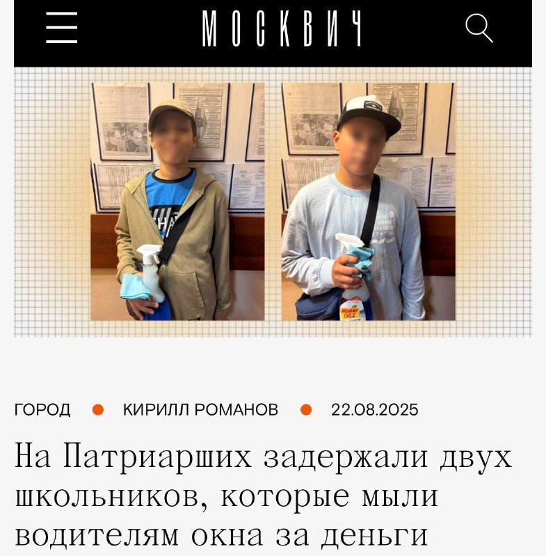 На Патриках повязали двух школьников, которые подрабатывали мойкой стёкол у люксовых тачек. По их словам, за такой сервис выходило по 200–250к в месяц. Но полиция решила иначе: пацанов обвинили в незаконном предпринимательстве, а штраф прилетел их родителям. Темка, мягко говоря, не зашла. Подробнее: https://hard-tm.su/threads/109192/ 🕹HARD-TM — Подписаться