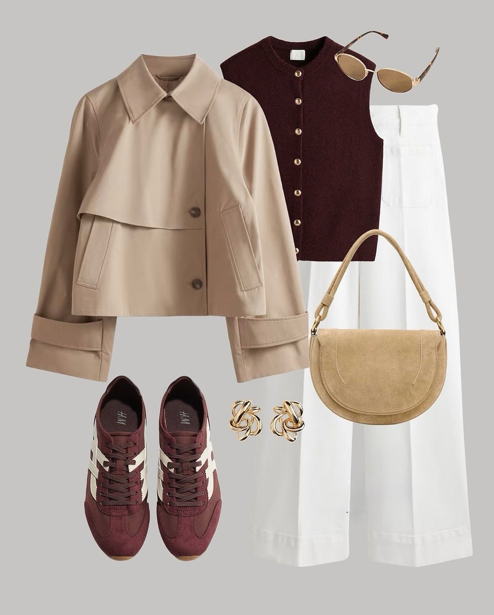 Этот look — учебник по осенней элегантности без скуки. Укороченный бежевый тренч строит фигуру, жилет марсала придаёт глубину, белые брюки «подсвечивают» низ, а ретро-кроссовки и замшевая сумка делают образ живым и современным. Возьмите формулу (беж + молочный + марсала + белый + золото), меняйте одну деталь — и вся осень будет работать на вас: свежо, дорого и очень функционально.