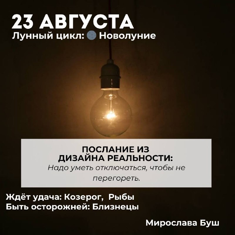 23 августа РЕКОМЕНДАЦИИ: 🌙 День наполнен равным количеством добра и зла. Будет полезно простить обидчиков, отпустить тяжелые чувства и завершить все незавершенное. 🏠 Проветрите дом, зажгите свечу или благовонию, добавьте в пространство подкову, камень или цветок, чтобы впустить благоприятную энергию. ❕Лай собак — знак допущенных за месяц ошибок. А еще в этот день не желательно попадать под дождь. К неприятностям. ✉️ Подписаться на Мирославу #прогнознадень