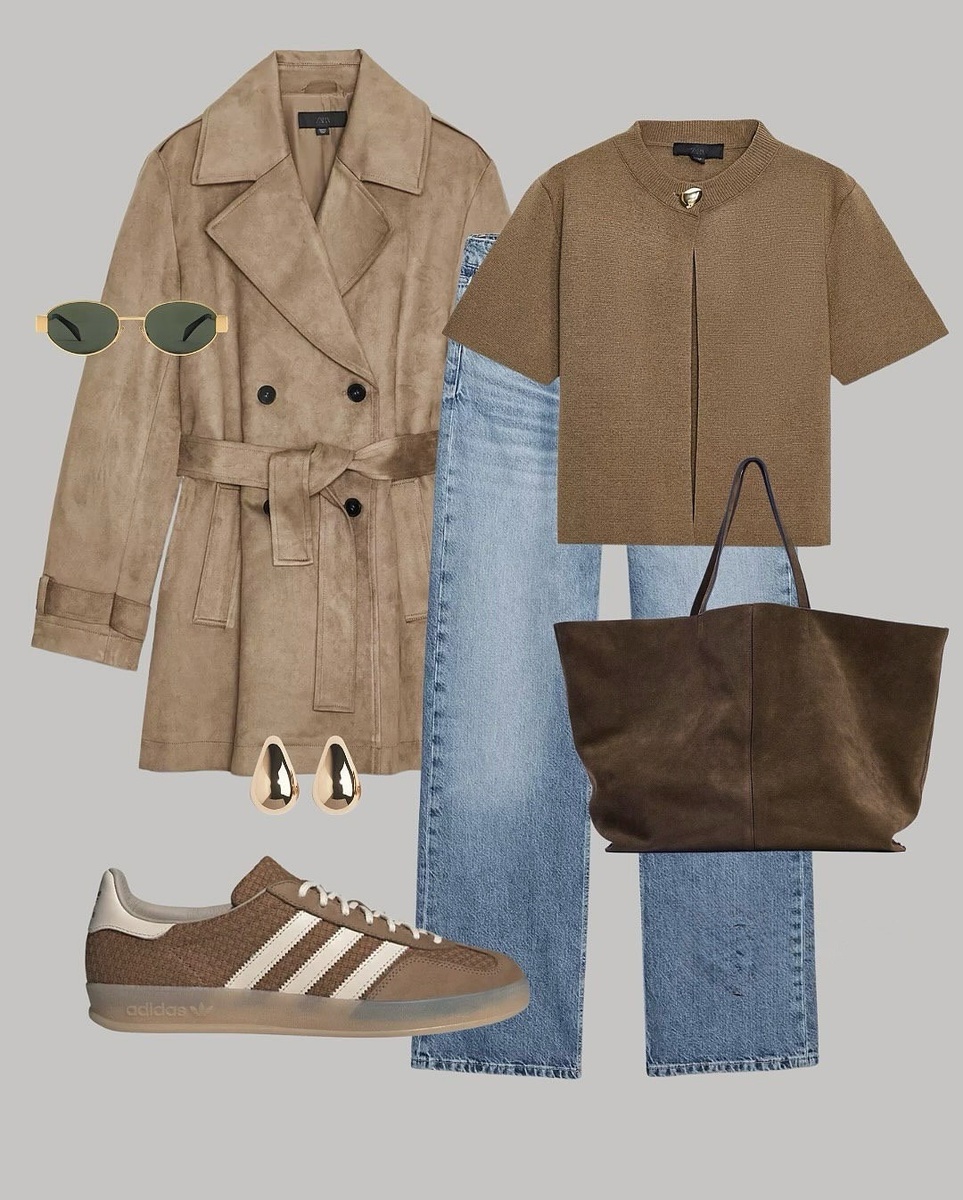 Осень — это сезон фактур. Когда воздух становится прохладнее, именно тактильность и нюансный цветсобирают образ «дороже цены». На фото — идеальная формула дневного стиля: песочный замшевый тренч, карамельный трикотаж, правильные джинсы, ретро-кроссовки цвета какао, большой шоппер и минималистичные аксессуары. Разобрала каждую деталь — что за вещь, как сидит, почему она здесь и как адаптировать под погоду и фигуру.