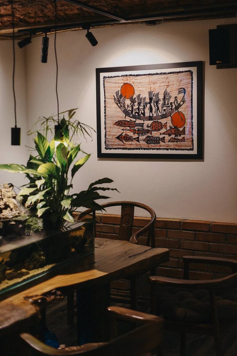 Когда мы путешествовали по Китаю, в одном из переулков Дали нам попались ткани — яркие, с необычными узорами. Мы тогда просто отошли от туристической улицы, заглянули в неприметные лавки, и там, среди пестрых полотен, нашли эти работы. Продавец объяснил, что это батик, ручная роспись по натуральной ткани, которую делают малые народности Китая. Труды таких этнических групп как Чжуан и Мяо, проживающих в небольших районах в провинциях Гуйчжоу, Гуанси, Сычуань и Юньнань, Чжуанском автономном районе. Эти небольшие этнические сообщества сохранили и многие другие древние традиции. В чайной постепенно появляются такие этнографические вещи. Почти всё, что висит на стенах, не просто декор, а что-то с историей. Это формирует ценность этих предметов. В нижней чайной 5 ярких и необычных, местами этнических изображений - ручная работа народности Чжуан. У них свой язык, своя культура, своя одежда и на первый взгляд их орнаменты кажутся не китайскими — но на самом деле это и есть Китай, тот, что хран