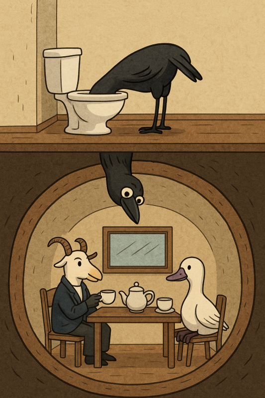 Тем временем галка Светлана уже приблизилась к унитазу. Она согнула лапки и встала раком, будто бы собравшись испить воды. Птица сунула голову в унитаз и, одна ее часть осталась торчать в туалете жопой кверху, а вторая часть (голова) - стала наблюдать, как парочка пьёт чай за столом в трубе.