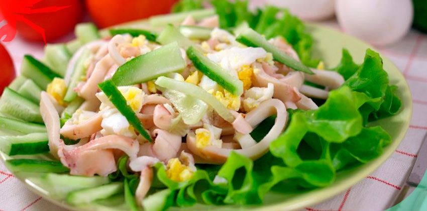 Ингредиенты: Отвариваем кальмаров и нарезаем соломкой. Моем и измельчаем огурцы. Очищенный лук нарезаем полукольцами.
