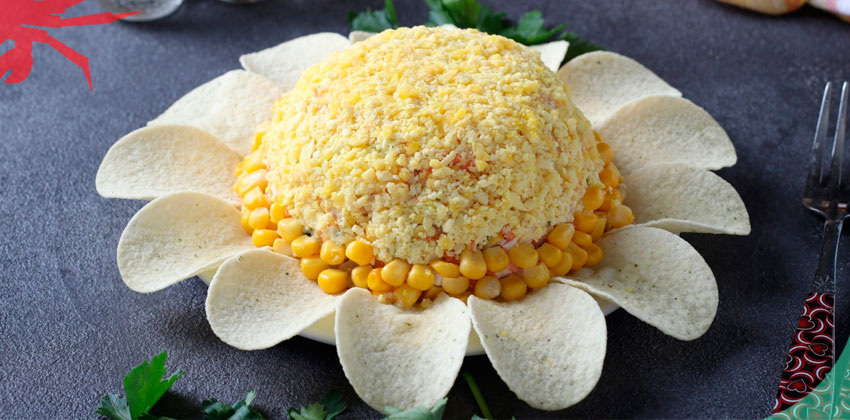 украшаем кукурузой. Вокруг салата выкладываем чипсы. Блюдо готово.