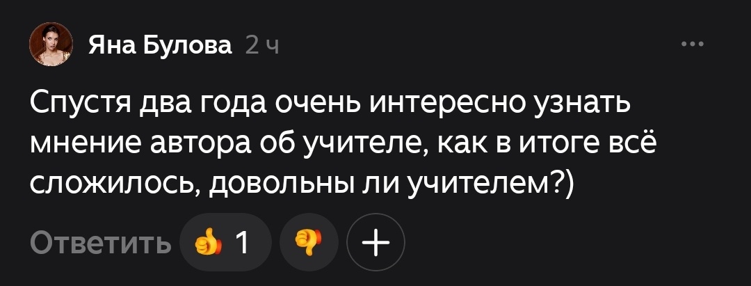 Наш случай — не единственное развитие событий. Всё, конечно, зависит от человека и его желания работать в этой сфере, а не в условном МакДональдсе после первого же года (ни на что не намекаю будто бы 😏). В комментариях к прошлым статьям писали разные истории: как у нас, так и с позитивным результатом. Так что не стоит смотреть на учителя без опыта предвзято, но и готовым к сюрпризам тоже нужно быть.
