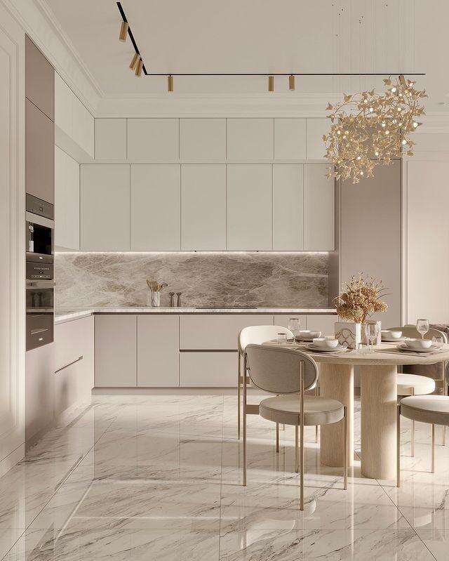 Рецепт выживания: Выбирайте спокойную, вневременную базу. Матовые фасады, простые и удобные ручки из нержавеющей стали, классический фартук из крупноформатного керамогранита или простой в уходе плитки. Акцентные трендовые вещи можно добавить в виде легко заменяемого декора.