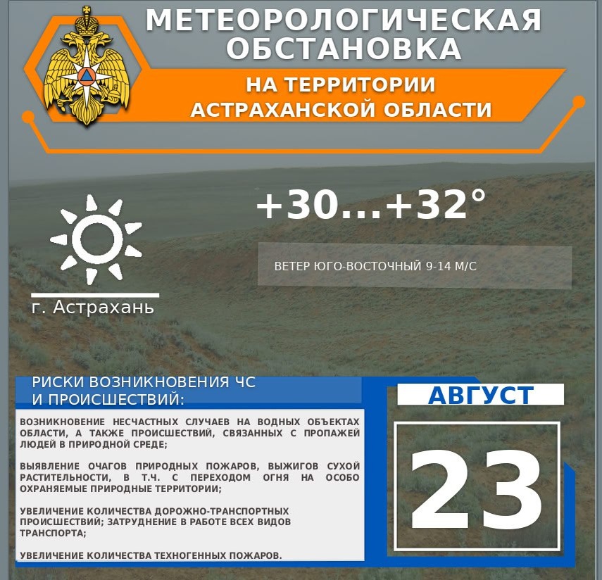 🌎Метеорологическая обстановка на 23 августа ☘️На территории области ясно☀️. Ветер юго-восточный 9-14 м/с. Температура воздуха +29...+34°🌡. 🌾По г. Астрахань ясно. Ветер юго-восточный 9-14 м/с. Температура воздуха днем +30...+32°🌡. ✅Присоединяйся к МЧС Астрахань 👉Подписывайся на МЧС России в Telegram | MAX