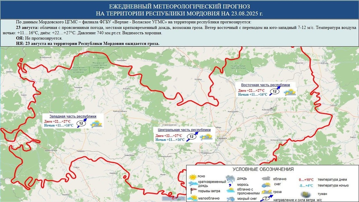 ☁️⛅⛈️ 23 августа в Мордовии облачная с прояснениями погода, местами кратковременный дождь, возможна гроза. Ветер восточный с переходом на юго-западный 7-12 м/с. Температура воздуха ночью: +11…16°С, днём: +22…+27°С. Давление 740 мм рт. ст. Происшествия | Подписаться | Предложить новость