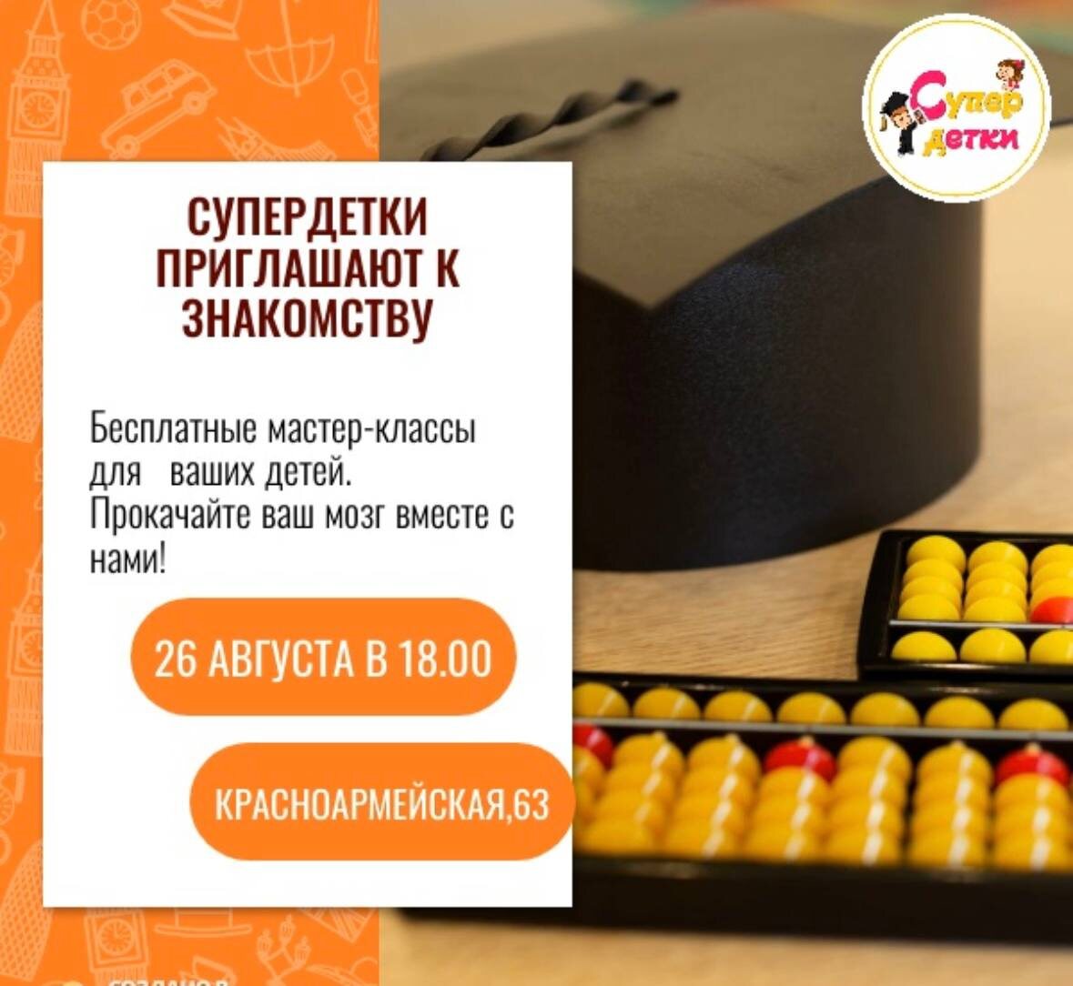 «СуперДетки» приглашают на бесплатные мастер-классы для детей Ждут в гости ребятишек от 4 до 12 лет В формате увлекательных минимастер-классов организаторы обещают познакомить ребят с направлениями центра, поделиться лайфхаками по тренировке интеллекта, а так же проверить, на креативность и умения нестандартно мыслить. 🕐26 августа, 18.00 📍Красноармейская, 63 #Новости Предложить публикацию:@zabkulisye_bot