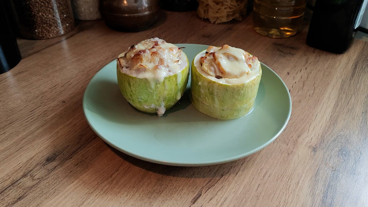 Приветствую, друзья! Сегодня у нас в меню фаршированные кабачки. Блюдо, которое не требует титанических усилий, но при этом выглядит очень даже презентабельно. Берем: Делаем: 1. Кабачки моем, отрезаем плодоножки и "попки". Если кабачки уже зрелые и шкурка толстая, лучше её счистить. Молодые можно оставить как есть. Режем кабачки на куски по 7 см. Это будут наши будущие "стаканчики". 2. Берём ложку (лучше чайную) и аккуратно выскребаем мякоть, оставляя дно толщиной около 1 см. Если проткнёте, фарш убежит, а нам такое не нужно. Вынутую мякоть трём на тёрке и отжимаем. Кабачки любят воду, но нам лишняя влага в фарше ни к чему. 3. В миску кладём отжатую кабачковую мякоть, фарш, мелко нарезанные грибы, соль, перец по вкусу. Всё тщательно перемешиваем. Можно добавить любимые специи: паприку, сушёный чеснок, зелень. 4. Наполняем кабачковые "стаканчики" фаршем (не жалеем, но и не перегружаем). Ставим их в жароупорную форму, заливаем 100 мл воды. Отправляем в духовку, разогретую до 200°C, на 45