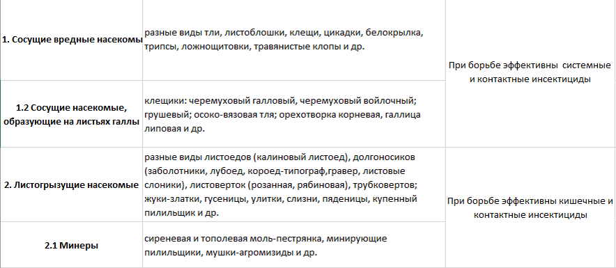В таблице приведены вредители, которых можно часто встретить в посадках у придомовой территории и инсектициды, которые воздействуют на них, на основе способности проникать в организм, характеру и механизму действия;