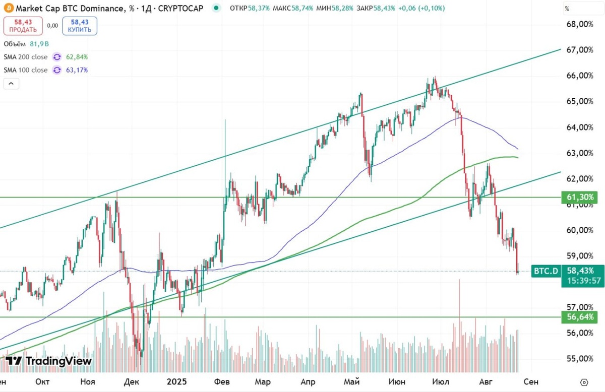#chiaбычийрынок #chiaтеханализ Доминация Биткоина начала активно снижаться. Вчера был достигнут минимум с начала года. Кроме того, был пробит вниз восходящий тренд, который формировался с 2023 года. Такая динамика говорит о перетоке ликвидности из Биткоина в альткоины. Dunktober не за горами 😉