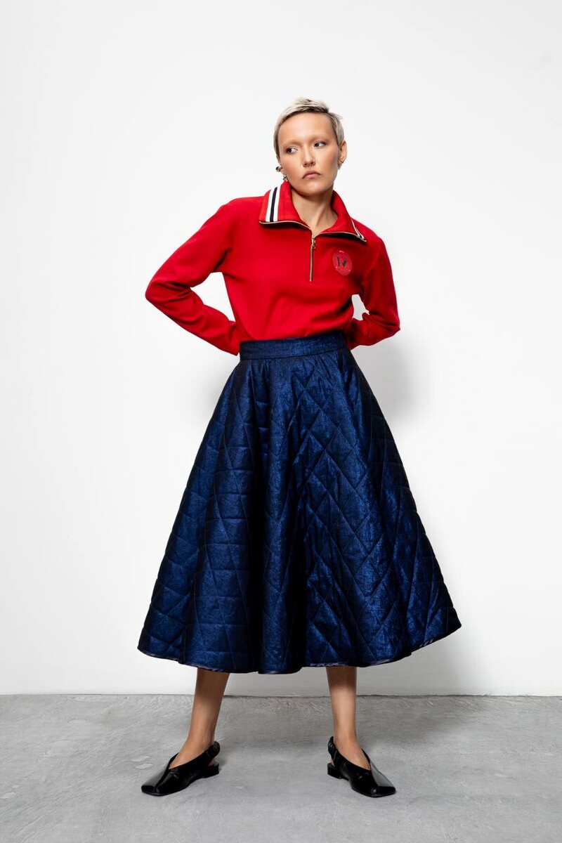Когда линейка Urban Vogue встречается с Punk Couture. Любимый образ наших светских героинь (coming soon). Стеганая юбка из жаккарда с металлизированной нитью и олимпийка-боди из тонкой шерсти. Предзаказ.