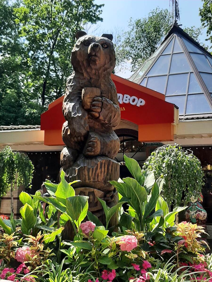 Продолжаю делиться впечатлениями от посещения Смоленска. В самом центре города целых 2 парка. При этом они здесь разбиты очень давно. Так вот в одном из этих парков, а именно в саду Блонье (городской сад имени Глинки) и находится очень интересное и атмосферное кафе "Русский двор". Перед самым входом встречает вот такой милый мишка: Вокруг вообще много интересных объектов, с которыми постоянно кто-то фотографируется: Внутри тоже очень атмосферно: Стены разрисованы как пряничный домик. Естественно, что не удержалась и попробовала рукой - стены деревянные, все что узорчатое - это вырезано. И все раскрашено. Чувствуешь себя в шкатулочке. Еду можно заказать через кассу или терминалы, после оплаты получаешь номер и ждешь, когда будет готово. Забираешь все самостоятельно. На двоих мы съели почти на 1700, из которых 259 рублей было кофе. Муж заказал свинину по-смоленски: Подают в горшочке. Было примерно пополам картошки и мяса. Кусочки мяса крупные, без жирка. Довольно сытное блюдо. Сказал, ч