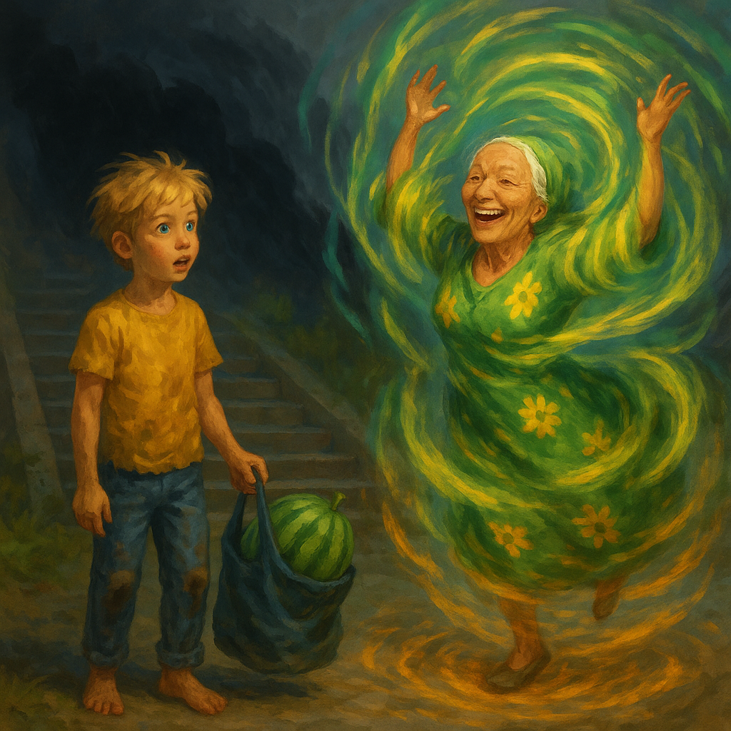 «Камни древних миров. Книга первая: Светлый мальчик» Глава 2. Поднявшись на ноги, Юра побежал дальше. Он чувствовал, как его уверенность растёт с каждым шагом. Он был готов ко всему. До лестницы, ведущей на верхнюю площадку парка, в правом конце которой, по словам Алии, был выход, оставалось всего несколько метров. Юра прибавил скорость. Добежав до лестницы, он остановился, заметив старушку в зелёном сарафане с жёлтыми цветами, которая охала и ахала, собирая разбросанные вокруг продукты. - Ой, какой мокрый и грязный мальчик, да ещё и босиком, - заметив его, сказала старушка. Юра смущённо опустил глаза. - Подай-ка, внучек, - позвала она мягким голосом. - Здравствуйте, - осторожно подошёл Юра, - вам помочь? - жестом указывая на разбросанные продукты, спросил он. - Да, внучек, спасибо. А ты не боишься той огромной волны? - Боюсь, - честно ответил Юра и стал быстро собирать продукты, закидывая их в сумку. - А где ты потерял свою обувь и почему такой мокрый и грязный? - спросила она, нагиба