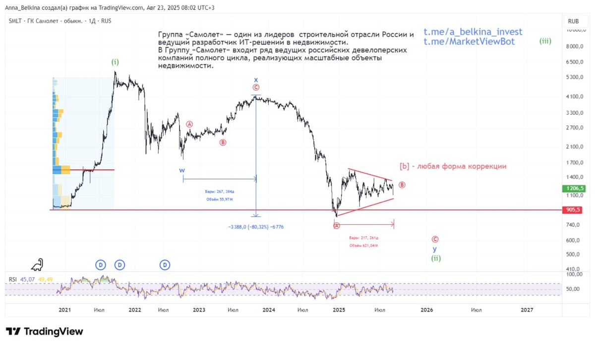 #Застройщики #SMLT На уходящей неделе следователи в очередной раз проводили обыски в офисах компании по уголовным делам о невыдаче ключей в двух ЖК Питера. Однако вчера вышли новости о том, что прокуратура не выявила обман дольщиков - уголовные дела отменили. Обыски, возбуждение уголовных дел, затем их отмена – всё это повлекло повышенную волатильность на акциях Самолета. По технике, без изменений - формируется коррекционная волна [b] of y of (ii). Она может принять любой вид коррекции, на графике отмечен треугольник. Важно, чтобы волна [b] of y of (ii) по продолжительности развития не превысила волну х of (ii). Далее ожидаю продолжение снижения в волне у of (ii) на завершение нисходящей структуры. Не является ИИР 💪 Бот Закрытого Канала (подписаться из-за границы, пишите личным сообщением)