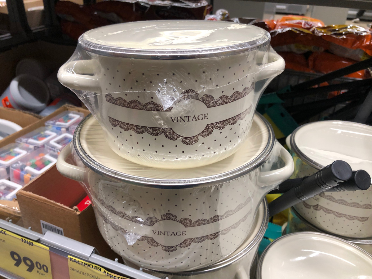 На этой неделе привезли вот такие классные кастрюли. Кастрюля эмалированная VINTAGE. Цвет: слоновая кость. Имеется красивый нежный декор. Объем 4 литра. В комплекте обычная крышка. Данная кастрюля подходит для всех видов плит. Изготовитель ООО «СТАЛЬЭМАЛЬ» г. Череповец.