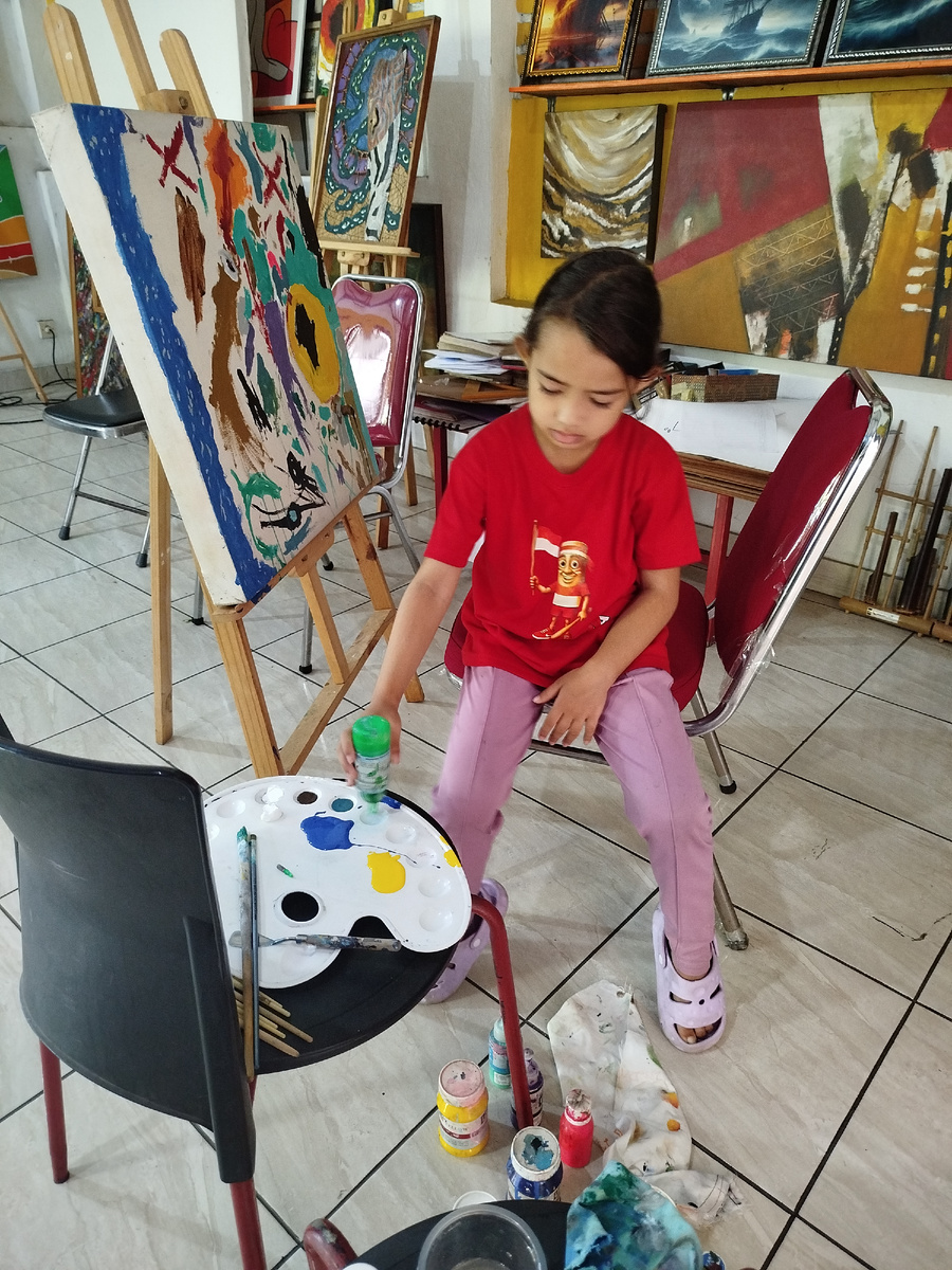 В субботу Амира прибыла в Галерею первая, даже раньше учителя, и сразу продолжила дорисовывать картину. Разлила нужные краски по выемкам палитры, выбрала кисти Потом пришёл художник, помог ей смешать цвета Оказывается, красные буквы Х - это места, где закопан клад. Драконы ведь любят клады. Ещё чуть позже пришла Элфита, принесла свою законченную картину Вот она крупным планом Учитель дал Амире печенье в упаковке с Мумий-троллями Они такие и оказались внутри А это Амирин Дракон с яйцом - законченный Вот что сказал чатГПТ, когда я спросила, сколько, по его мнению, лет художнику Умеет делать комплименты. Картин уже достаточно для выставки - можно организовывать. Я также сняла небольшое видео галереи А в воскресенье проводилась оценка и отбор картин для выставки. Но об этом потом.