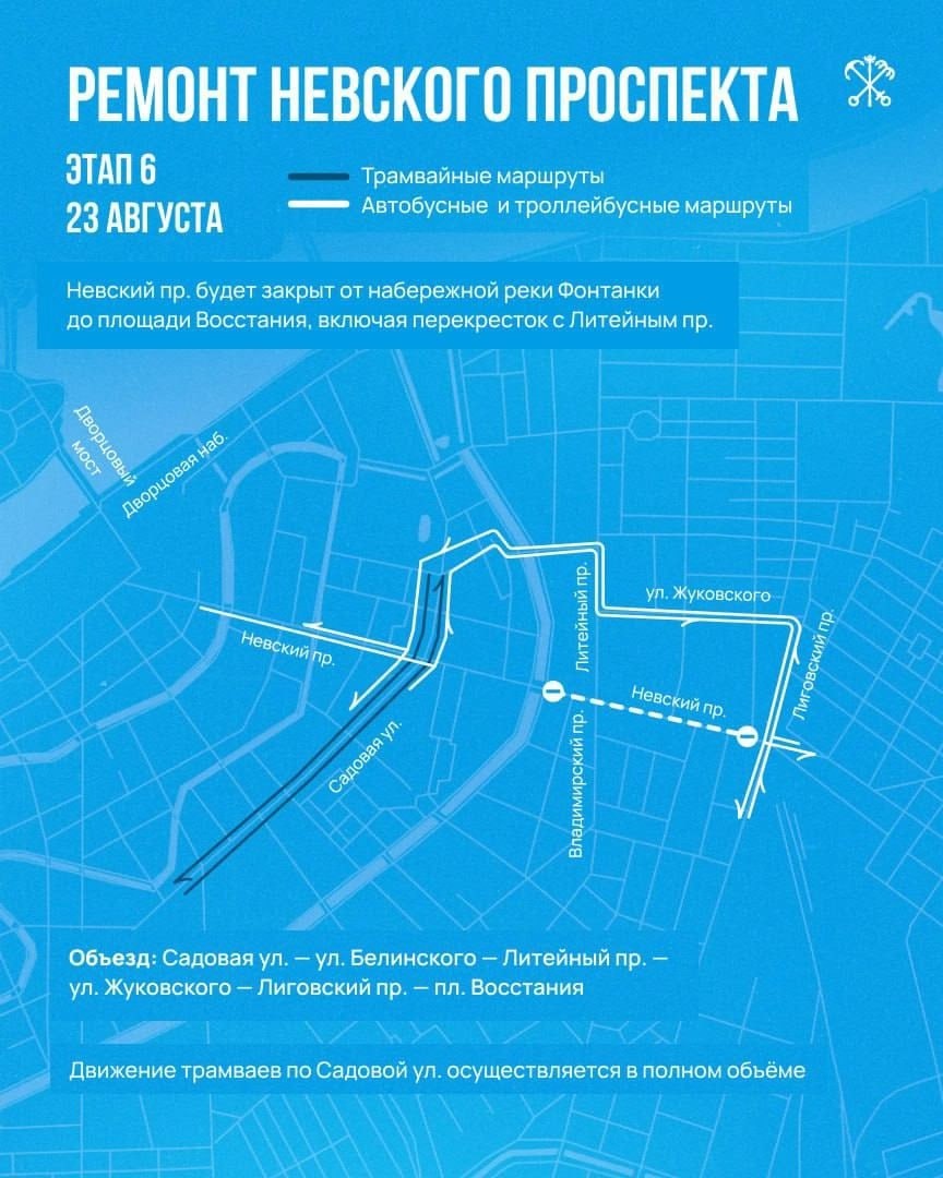 ⚠️ Закрытие Невского проспекта Сегодня, 23 августа, движение транспорта по Невскому проспекту перекрыто от набережной Фонтанки до площади Восстания. Закрыт также перекресток с Литейным проспектом. 🚗 Как объехать: через Садовую улицу и улицу Белинского, по Литейному проспекту и улице Жуковского, через Лиговский проспект и площадь Восстания. Фото: Группа Правительства Санкт-Петербурга Петербургский дневник