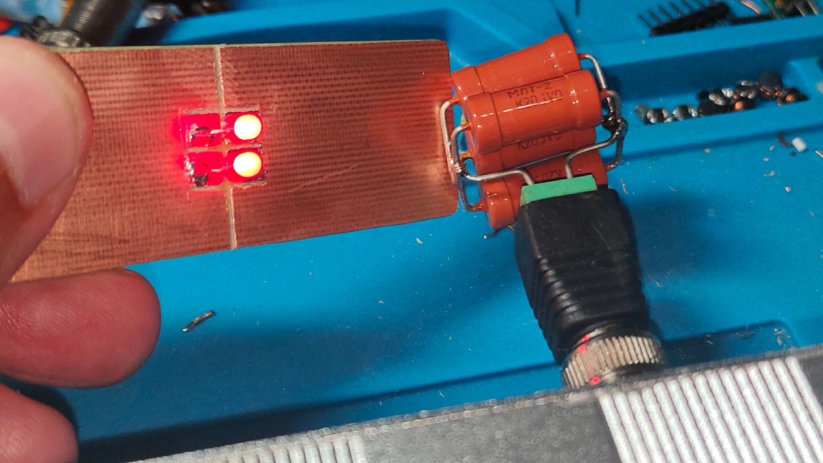 Красные светодиоды используются поскольку они имеют минимальный порог напряжения, при котором начинается свечение. Автор, насколько я мог судить использовал светодиоды с диаметром 5 мм. У меня же в наличии оказались 3-миллиметровые. Разницы нет. Можно было бы и SMD вариант приспособить.