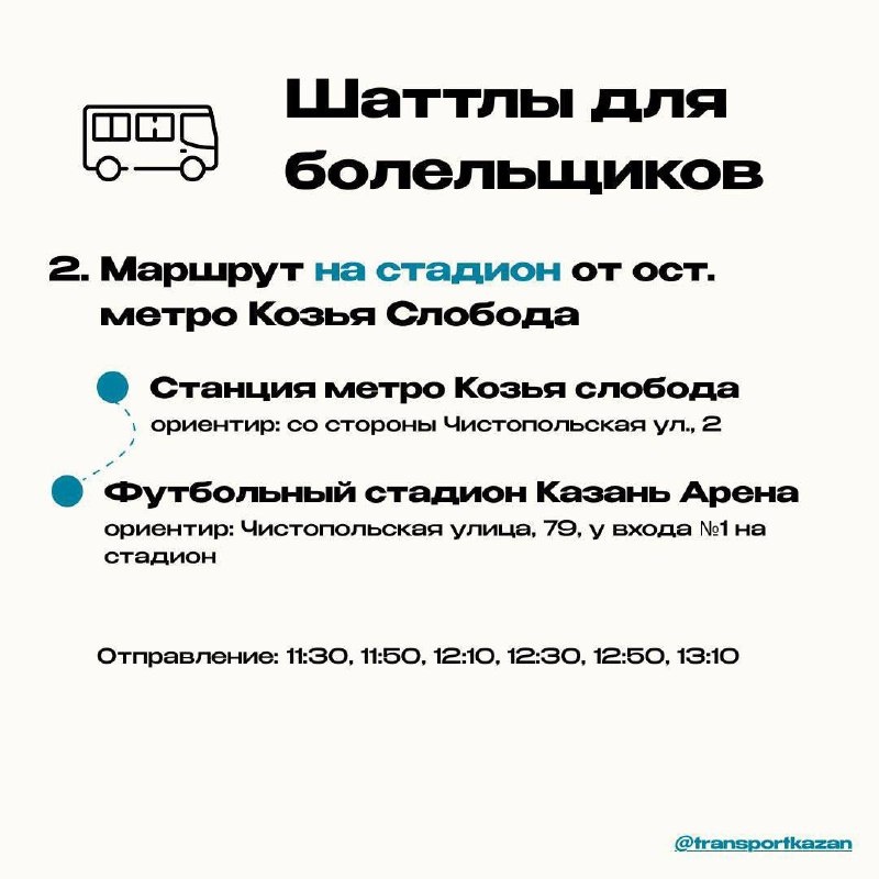 Бесплатный транспорт будет курсировать от станций метро «Проспект Победы» и «Козья Слобода» до стадиона и обратно с интервалом 10–20 минут. Дополнительные рейсы организованы в связи с матчем «Рубин» — «Спартак».