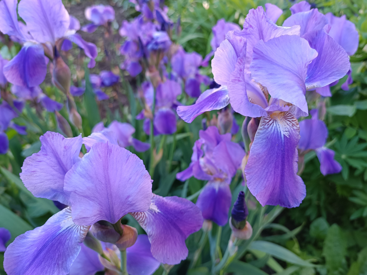 - Ирисы бородатые: корневище почти на поверхности, «плечо» наполовину видно. Полив — 5–8 л/делёнку.