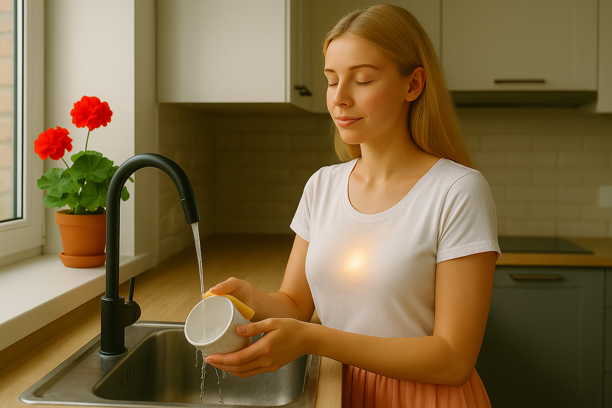 (Читайте с начала весь цикл историй "Начало Пути" здесь) Я шла домой медленно. Не потому что устала — а потому что не хотелось торопить день. Он был наполнен. Не событиями. А вниманием. И вот я дома. На кухне кипит чайник. Собака просит ужин. Посуда всё так же стоит в раковине, как в любой другой день. Только я теперь была — другой. Я мыла чашку — и вдруг поймала себя на том, как чувствую движение воды. Слышу звук, когда фарфор касается стекла. Чувствую тяжесть руки. Температуру воздуха. Всё это было и раньше. Но раньше — не было меня. Потом я встала, закрыла глаза. И просто дышала. Не медитировала. Не выполняла практику. Просто стояла. И дышала. И вдруг снова — как в тот момент утром — руки начали движение. Сами. Медленно. Как будто вспоминая. И я поняла: