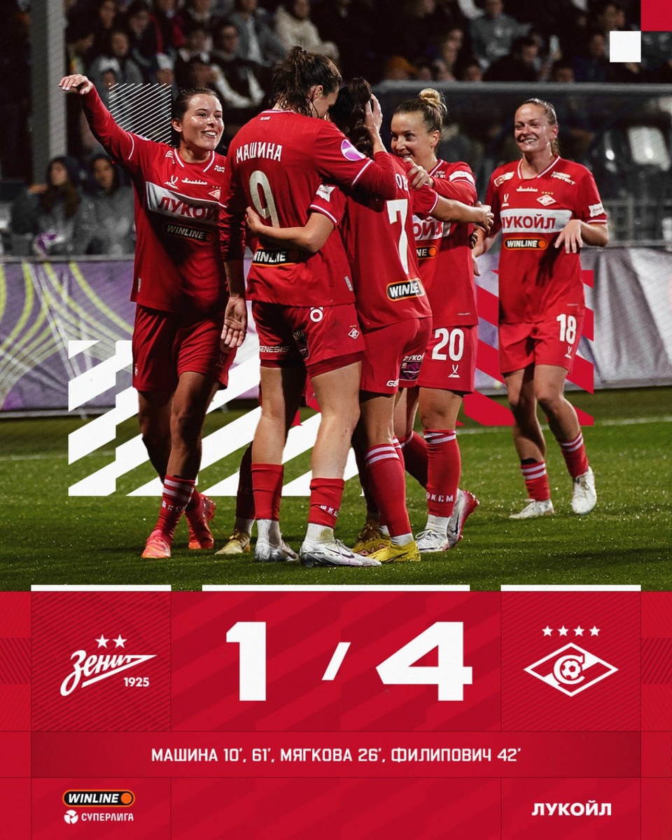 Вчера женский «Спартак» в гостевом матче разгромил питерский «Зенит» со счётом 4:1. А «Зенит», я вам напомню, чемпион прошлого сезона. Причём разгромил женский «Спартак» «Зенит» абсолютно по делу. Хочу вам напомнить, что женская команда «Спартака» была создана только в прошлом году. И сейчас имеет на своём счету серию 17 матчей без поражений. Если брать исключительно этот сезон, то «Спартак» имеет серию из семи побед подряд и абсолютно по делу занимает первое место в таблице женского чемпионата страны. Честно признаюсь, я не особо любитель женского футбола, как по мне, он выглядит очень медленным, особенно на контрасте с футболом мужским, но некоторые матчи смотрю, особенно когда делать нечего. Ну, а вчерашний матч посмотрел просто потому, что очень интересная вывеска. И я вам скажу, что качество футбола было достаточно высоким, особенно для женского футбола в нашей стране. Дубль Машиной, голы Филипович и Мягковой предупредили результаты этой встречи. А вот мужскому «Спартаку» побед