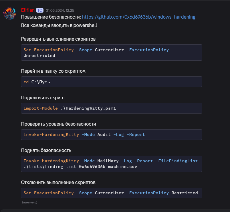 Все команды вводить в powershell Разрешить выполнение скриптов Set-ExecutionPolicy -Scope CurrentUser -ExecutionPolicy Unrestricted Перейти в папку со скриптом cd С:\Путь Подключить скрипт Import-Module .\HardeningKitty.psm1 Проверить уровень безопасности Invoke-HardeningKitty -Mode Audit -Log -Report Поднять безопасность Invoke-HardeningKitty -Mode HailMary -Log -Report -FileFindingList .\lists\finding_list_0x6d69636b_machine.csv Отключить выполнение скриптов Set-ExecutionPolicy -Scope CurrentUser -ExecutionPolicy Restricted