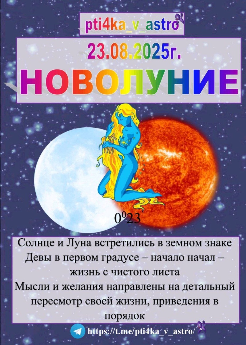 🛁 Новолуние чистоты, порядка ♍ Наступило 23.08.2025г. в 09:05:27 мск ☀️🌙 Солнце и Луна встретились в трудолюбивом знаке Дева ♍ ⚡ Энергия месяца направлена на чистоту, порядок и оздоровление 📋 Важно прописать планы и выполнить рутинные задачи 🧘♀️ Оздоровить организм, спланировать бюджет, чтобы накопить денежные средства на полезные вещи, встречи, мероприятия ☺️ 📝 Прописывайте свои планы и желания в настоящем времени до 25.08.2025г. представляя, как они осуществляются и становятся реальными ‼️ Внимание! 🌙 Всех желающих приглашаю на Марафон "Усиление Светил" ☀️ 🔭 За месяц прокачаете Солнце и Луну А также узнаете задачи на текущий год и ваше воплощение 🐣 ‼️ Знания остаются с Вами навсегда 💸 Стоимость - 2508 руб. ✍️ За подробной информацией пишите @pti4kaVastro