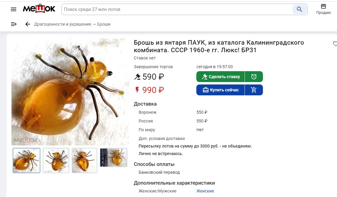 На продажу выставлена брошь ПАУК, в описании дана информация, что брошь есть в каталоге Калининградского комбината и изготовлена в 1960-е годы.
