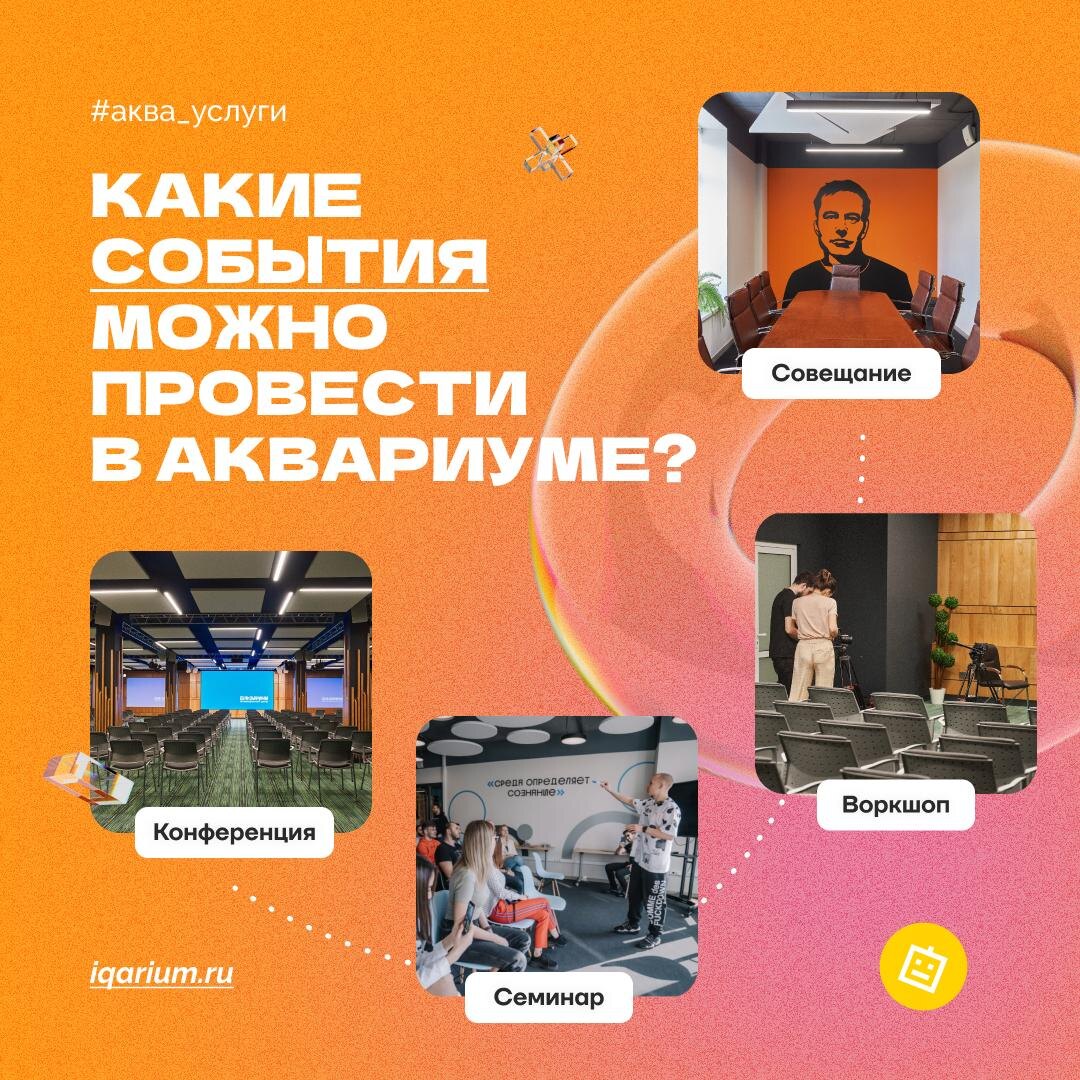 😐 Аренда площадки = куча ограничений и головной боли А у нас наоборот: делаем всё так, чтобы ивенты проходили легко Аквариум — это площадка для деловых встреч, обучения и корпоративных движух. Чего у нас точно нет: 🟢жёстких лимитов по времени, конференц-залы можно бронировать круглосуточно от 1 часа, переговорки с 8 до 20; 🟢техники, к которой не помогают подключиться; 🟢ограничений по форматам и темам событий; 🟢стульев «для пыток», все залы оборудованы так, чтобы людям было удобно сидеть и работать. Что можно организовать: 1️⃣ Конференции Современные залы, микрофоны, проекторы, LED-видеостена. Подойдёт для отраслевых событий и профессиональных встреч. 2️⃣ Семинары Интенсив на пару часов или целый день. Можно провести в переговорке или в конференц-зале. 3️⃣ Воркшопы Когда важно послушать и прокачать навыки на практике, идеально подойдет лекторий 😉 4️⃣ Собрания и совещания Закрытые переговорки для рабочих встреч от стратегических обсуждений до быстрых апдейтов по проекту. 5️⃣ Тимб