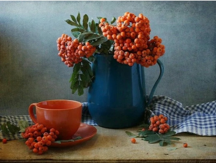 В этом году я живу в ритме с природой - фотографирую цветы, меняю постеры в соответствии с тем, что сейчас цветет. Делаю картинки в шедевруме на тему сирени, одуванчиков, ирисов и рябины. Сейчас - время оранжевой рябины. Красиво смотрятся на небольших деревцах оранжевые ягодки. Сегодня я делюсь с вами красивыми натюрмортами с рябиной. Хорошего вам августовского настроения! Веселенький натюрморт с оранжевой и синей керамикой. Скромный и лаконичный натюрморт с акцентом на рябине. Великолепно! Рябина в плетеной корзине. Натюрморт в стиле старых мастеров. Уютный натюрморт с яблоками и берестяной кружкой. Милый натюрморт с рябиной, где используется старинный чайник. Аппетитный натюрморт. Так и хочется попить чая, любуясь ягодами рябины! Рябиновые бусы. Поэтичный натюрморт. И снова уютный натюрморт с яблоками. Август - время рябины и яблок. Какой натюрморт понравился вам больше всего? Мне, честно говоря, нравятся все!