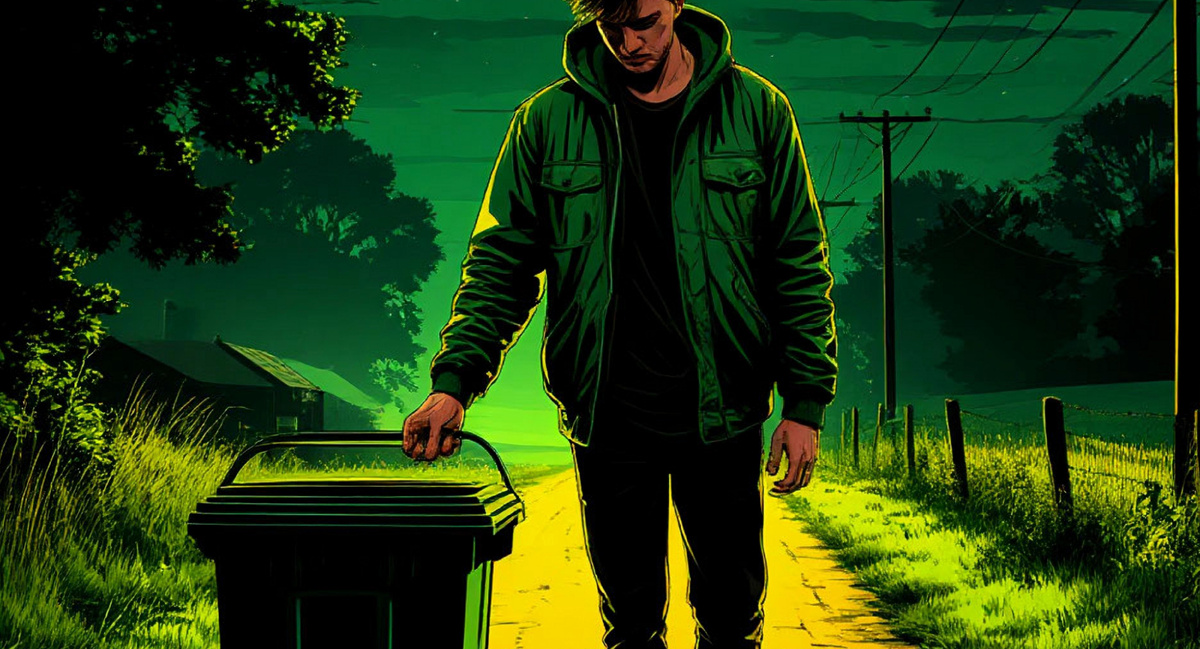 Я иду по подъездной дорожке, насвистывая любимую мелодию, глядя на звёзды и волоча тяжёлый мусорный бак, полный отходов, к дороге. По мере того как я продвигаюсь по подъездной дорожке, становится всё темнее, но к тому моменту я уже неплохо ориентировался. Далёкий свет фонаря на крыльце служит мне слабым ориентиром.