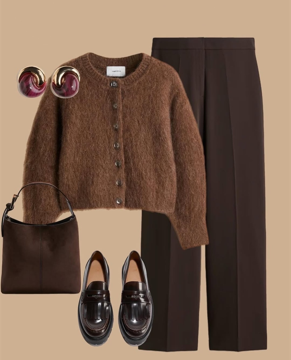 Осенью выигрывают те, кто умеет работать с фактурами и полутоном цвета. На фото — безошибочный рецепт «тихого люкса»: пушистый кардиган, строгие брюки со стрелкой, лаковые лоферы, замшевая сумка и серьги с бордовым акцентом. Разбираем каждую деталь отдельно, а затем — как собрать капсулу и адаптировать комплект под разные фигуры, рост и погоду.